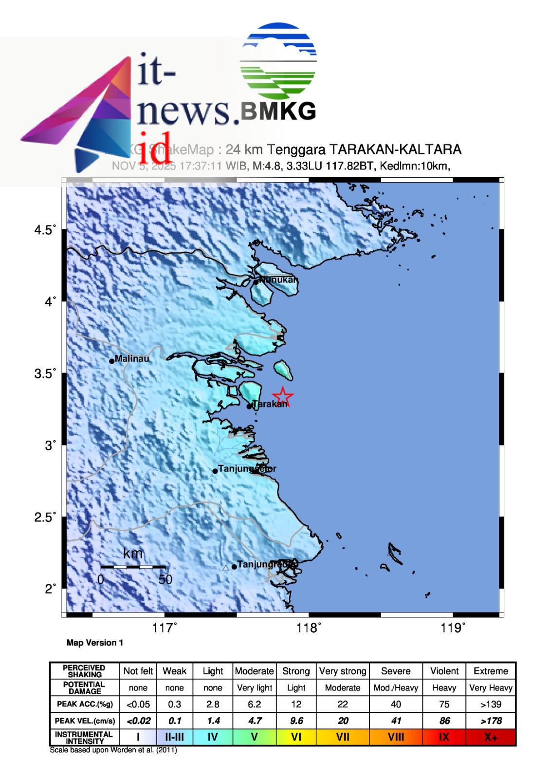 III–IV MMI di Tanjung Selor, Berau, dan Nunukan serta III MMI di Malinau.