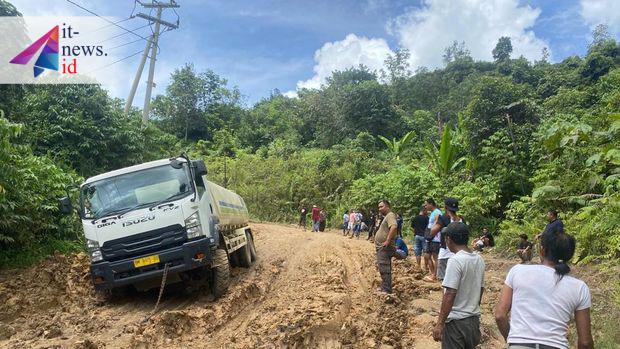 Kondisi jalan yang rusak parah membuat kendaraan kesulitan melintas, sementara truk-truk besar kerap terperosok di jalan berlumpur.